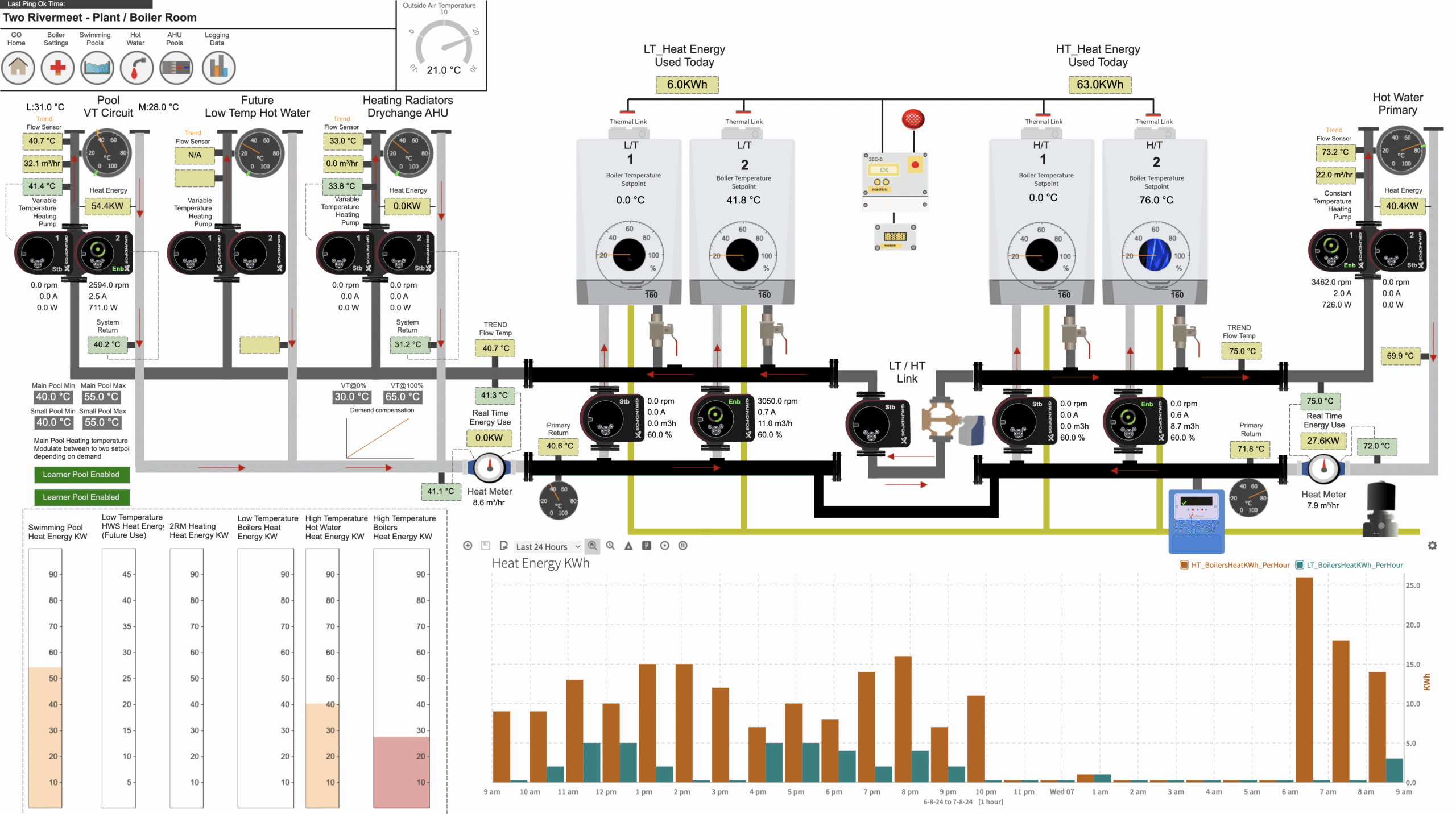 The project then entailed the complete strip out of existing aged gas boilers, gas fired hot water heaters, pump sets, pressurisation units, water softeners, all pipework, control systems and builders’ bases, etc. Complete replacement of all the above with modern energy efficient equipment and a Trend BMS control package and a permanent Energy Monitoring System, all completed whilst avoiding any disruptions to the leisure complex’s normal operations.